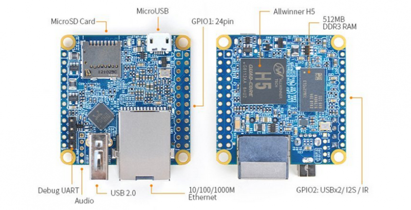 Poursuivons avec le NanoPi Neo2 Allwinner H5. Compact, il intègre un port Ethernet Gigabit, un port USB 2.0, une sortie audio ainsi qu’un slot pour micro SD. Ce nano-ordinateur possède 512 Mo de mémoire vive et un processeur quadcore. Vous remarquerez que le NanoPi Neo 2 ne possède pas de sortie vidéo et qu’il faudra passer par une autre machine pour le piloter. Il supporte néanmoins différentes versions de Linux. Vous le trouverez à moins de 40 euros.